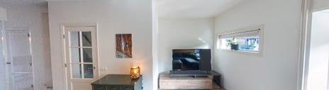 * Woonkamer met fraaie houtkachel en sfeervolle houtenvloer;