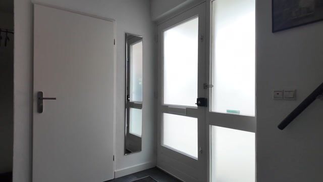 De ruime, representatieve hal biedt plaats aan de open trapopgang, de volledig vernieuwde meterkast en het half hoog betegelde moderne toilet met wandcloset en fontein. De vloer is voorzien van een fraaie antraciet kleurige tegel. De trap naar de verdiepingsvloer is van hardhout en de treden zijn bekleed met vinyl.