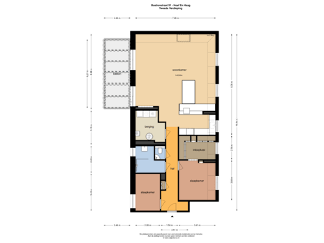 Bij binnenkomst in het appartement leidt de hal naar alle vertrekken. Zo vindt je hier een praktische garderobenis, de meterkast en een luxe afgewerkte toiletruimte, welke is voorzien van een vrijhangend toilet en een fonteinmeubeltje. De moderne badkamer biedt een ruime inloopdouche met regendouche, handdoekradiator en een stijlvol wastafelmeubel met daarboven een spiegelkast. In de volledig betegelde technische ruimte/bijkeuken zijn de warmtepomp, balansventilatie-unit, witgoedaansluitingen, omvormer en een gootsteen geplaatst. Voorts zijn er 2 twee slaapkamers te vinden, waarvan de masterbedroom is v.v. een dakkapel en een aangrenzende garderobekamer, de 2e slaapkamer is uitgerust met vaste kasten en een computerkast met werkplek. Aan het eind van de lange gang is een schitterende stalen taatsdeur v.v. rookglas geplaatst, welke toegang geeft tot de royale woon-/eetkamer van ca. 52 m² met open keuken van ca. 10 m².