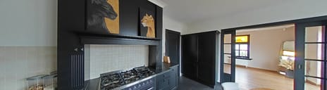 De ruime woonkeuken beschikt over openslaande deuren naar de achtertuin. Hierdoor is er een prettige hoeveelheid aan daglicht en een optimale verbinding met buiten. De moderne keuken bestaat uit een L-vormige keukenunit die is uitgerust met diverse vaste kasten en hoogwaardige inbouwapparatuur. Onder andere een Boretti-fornuis met zes gaspitten en een oven, een schouwmodel afzuigkap en een vaatwasser.