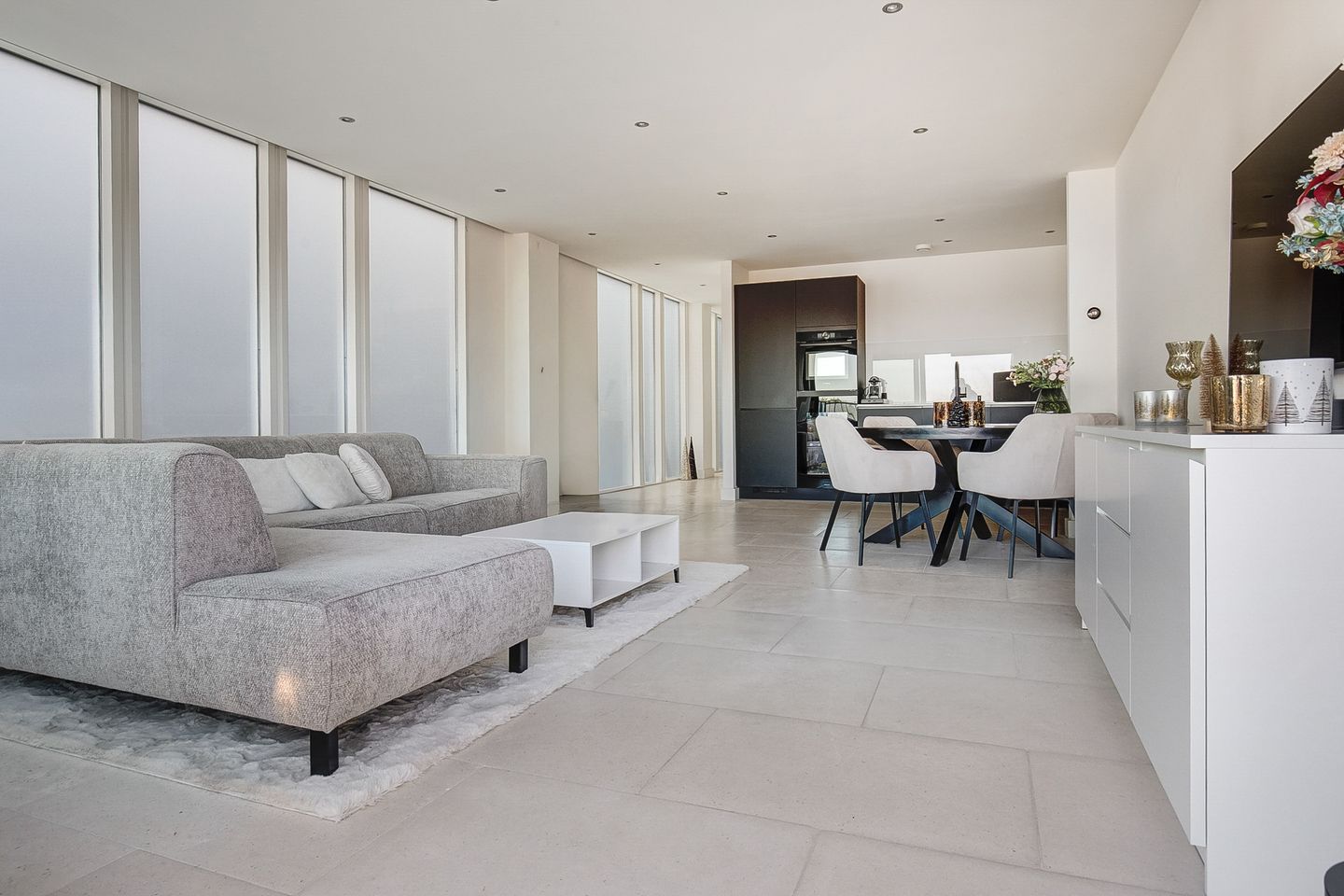 The exceptionally spacious living area forms the heart of the home and is characterized by large windows that provide an abundance of natural light. The stylish open-plan kitchen connects seamlessly with the living space and features a modern design with high-quality built-in appliances, including, among others, an integrated wine climate cabinet. This is an ideal setting for those who enjoy cooking in a luxurious and comfortable environment.
