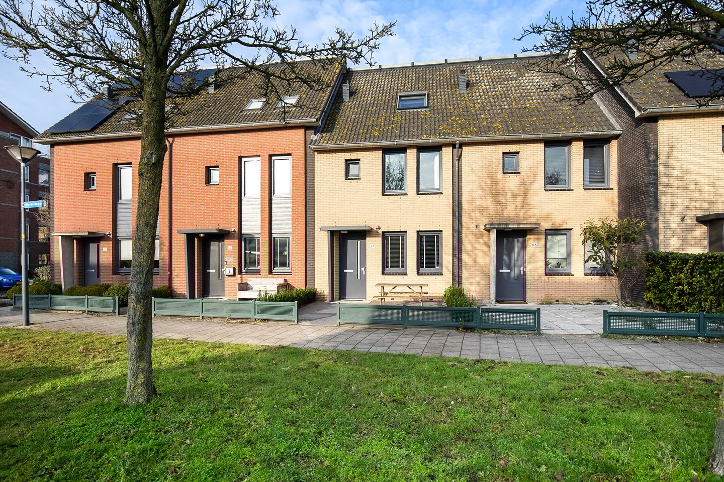 Spacious four-bedroom house in the child-friendly De Pleinen neighborhood in Floriande. The house features a living room with an open-plan kitchen, a bathroom, and spacious front and back gardens with a lockable canopy and electric awning. At the front is a public garden with adjacent parking on public property.