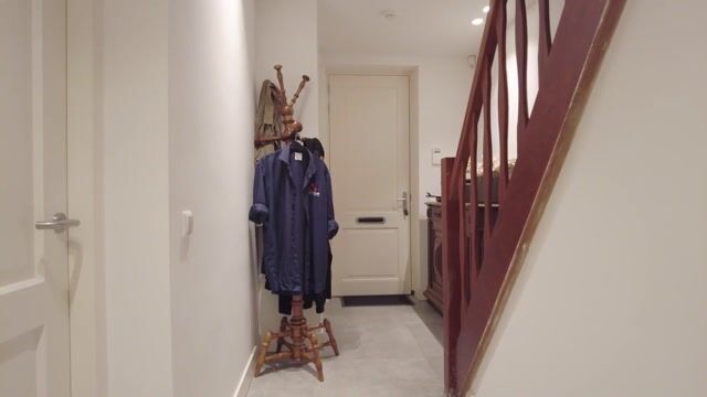 De entree is afgewerkt met een tegelvloer en stucwerk als wand- en plafondafwerking met spotverlichting. De hal geeft toegang tot de meterkast (automaat, 14 x 220V (1x kook), 1 x 380V, 1x PV en 3 aardlekschakelaars), de slaapkamer op de begane grond, de woonkamer met open keuken en de trapopgang naar de eerste verdieping.