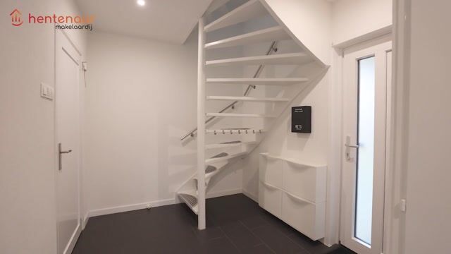 Bij binnenkomst valt meteen de strakke afwerking op: de entree beschikt over een moderne witte trapopgang met aluminium leuningen, een ruime meterkast met 20 groepen en een net toilet met fontein. Vanuit de hal is er toegang tot zowel de L-vormige woonkamer als de bijkeuken.