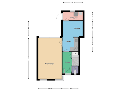 Begane grond: entree/hal, meterkast, trapkast, toilet/wandcloset, sfeervolle doorzon-woonkamer met mooi kliklaminaat, dichte keuken met een eetgedeelte, bijkeuken met witgoedaansluitingen en een buitendeur naar de achtertuin.