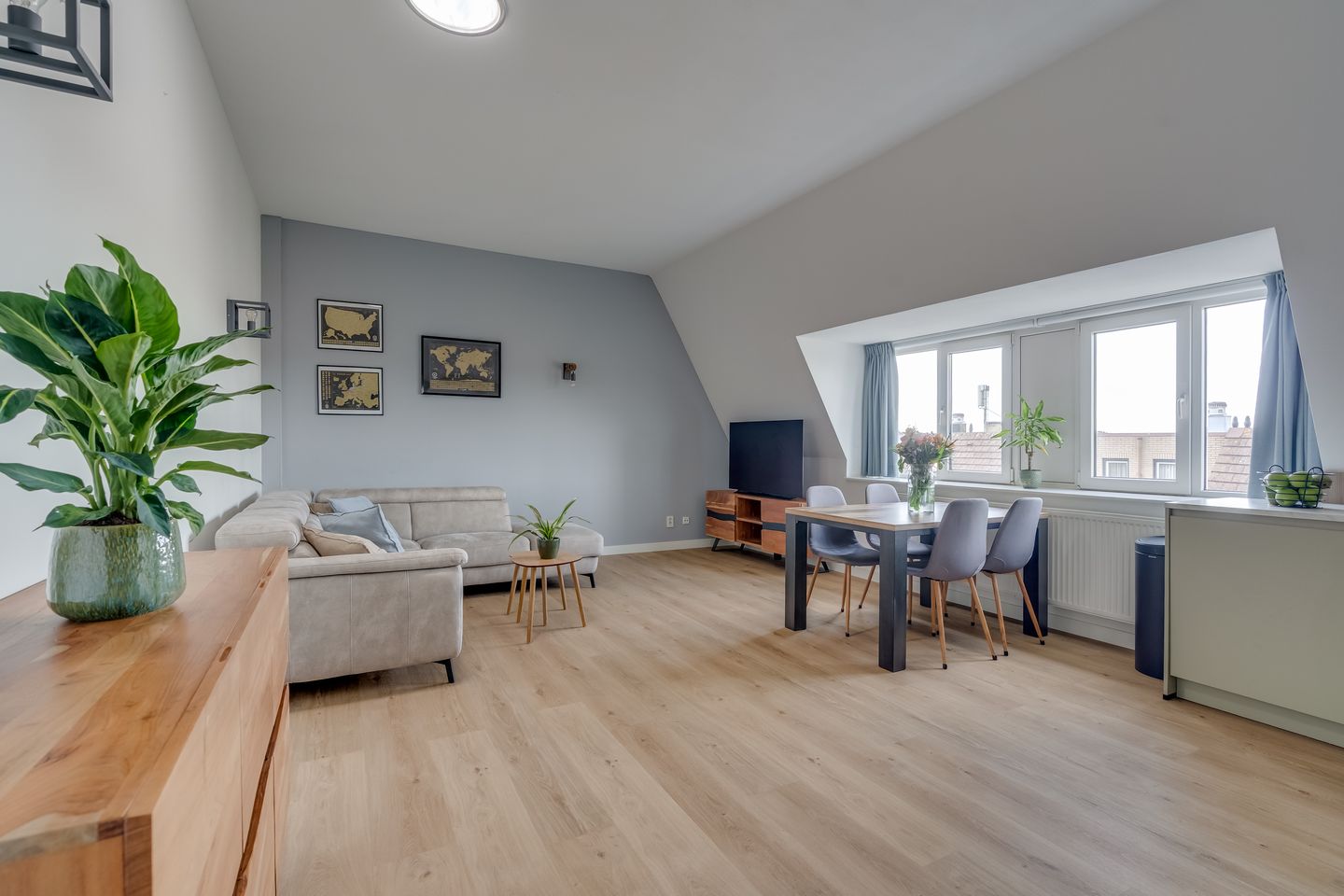 The living room and kitchen form a single open space, filled with natural daylight, further enhanced by a solar tube. A charming detail is the feeling of being "under the roof" — with the sloped ceiling in the kitchen and the angled wall in the living room adding character. The kitchen, newly fitted in 2024, features an L-shaped layout in a soft green colour scheme and is, of course, equipped with various built-in appliances.