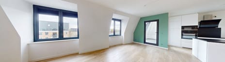 Vanuit de woonkamer stap je de loggia op – een beschutte buitenruimte die je eenvoudig bij je woonruimte betrekt. Hier geniet je van een leuk uitzicht en een rustige plek om buiten te zitten, ook bij minder mooi weer.