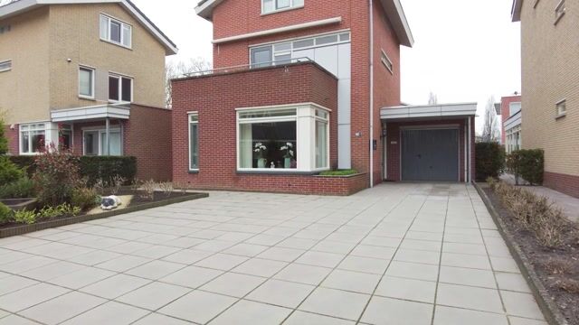 De voortuin is deels bestraat, waardoor er een oprit is ontstaan met parkeergelegenheid voor twee auto’s op eigen terrein.