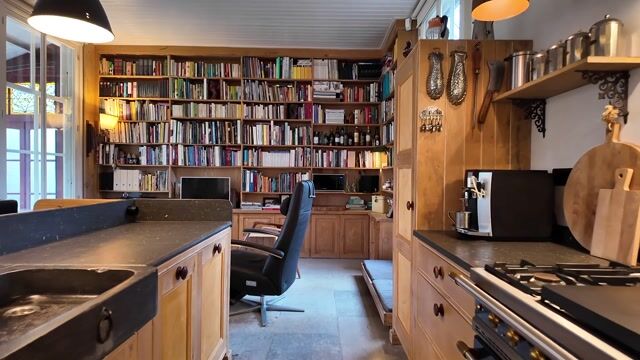 De woonkeuken is in 2019 vernieuwd en vormt een sfeervol en functioneel middelpunt van de woning. Uitgevoerd in een tijdloze, landelijke stijl met massief houten kasten, een royaal kookeiland en een robuust hardstenen werkblad. Blikvanger is het hoogwaardige Lacanche-fornuis, dat perfect past bij het karakter van de woning en uitnodigt tot uitgebreid koken. De woonkeuken is verder voorzien van diverse inbouwapparatuur en een kokendwaterkraan, wat het dagelijks comfort compleet maakt. De open verbinding met de leefruimte en de royale maatvoering maken deze keuken uitermate geschikt als woonkeuken: een plek waar wordt gekookt, gewerkt, gelezen en samengeleefd.