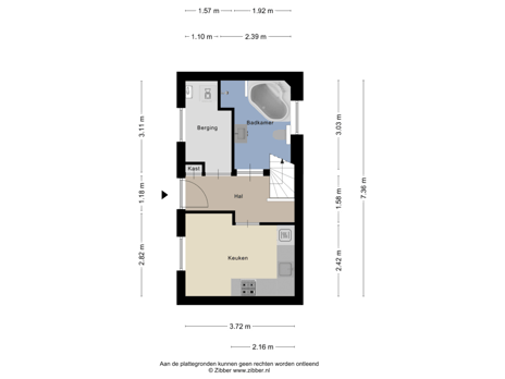 Via de entree kom je in de hal met trapopgang naar boven. Vanuit hier zijn de keuken, badkamer en berging/wasruimte bereikbaar.