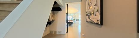 De verdieping is bereikbaar via een stijlvol trappenhuis met subtiele verlichting boven de treden. Hier bevinden zich drie slaapkamers, waarvan één momenteel als kantoor wordt gebruikt. De eerste badkamer is voorzien van een inloopdouche, toilet en wastafelmeubel.