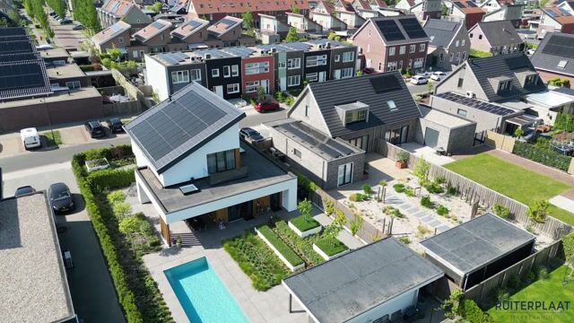 Binnen wacht een lichte en ruime woonkamer, voorzien van twee aparte zithoeken. De open woonkeuken is een echte blikvanger, met een royaal kookeiland inclusief geïntegreerde afzuiging, Quooker, TV-lift en een bargedeelte. De kastenwand biedt ruimte aan hoogwaardige inbouwapparatuur van Miele en Liebherr en een koffienis. De keuken en eetkamer sluiten naadloos op elkaar aan, ideaal voor wie graag kookt én samen geniet.