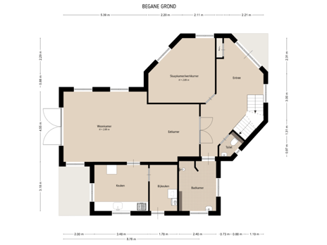 Via de voordeur komen we in de royale entree. Zo groot als een flinke kamer én met een 2,90 meter hoog plafond. De begane grond is voorzien van vloerverwarming en radiatoren. De entree brengt je naar de trapopgang, meterkast met glasvezel voor supersnel internet, slaapkamer, toilet met fonteintje, badkamer en woonkamer.