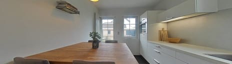 Aansluitend treft u de royale bijkeuken (ca. 3,65 x 3,00 m) met extra werkblad, keukenkastjes, vaatwasser en aansluitingen voor de wasmachine.