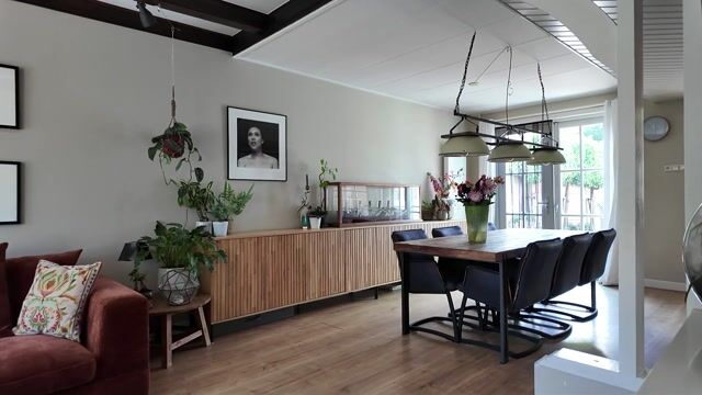 De lichte woonkamer met houten vloer en leuk uitzicht op de Wagendijk is aan de voorzijde van de woning gelegen. De eethoek met open keuken is aan de achterzijde gelegen. De open keuken met deur naar de achtertuin en deur naar het klompenhok is eveneens aan de achterzijde gelegen. De keuken is voorzien van diverse inbouwapparatuur zoals een inductiekookplaat, combi-oven/magnetron, afzuigkap, vaatwasmachine en losse Amerikaanse koelkast.