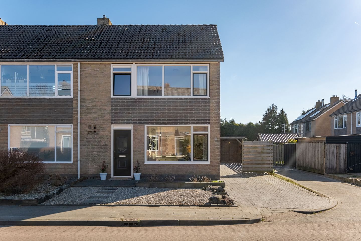 Laten we een ronde door de woning doen. Doordat je op de hoek woont, heb je een eigen oprit die ruimte biedt voor twee auto's. Via de onderhoudsarme voortuin komen we in de entree, die toegang geeft tot het toilet, de trapopgang, de trapkast en de keuken. De keuken is ruim opgezet, waardoor je voldoende werkruimte hebt. De woonkamer is opvallend diep en heeft een heerlijke lichtinval door de ramen aan beide zijden. Aan de achterzijde bevindt zich de bijkeuken, waar de witgoedopstelling is en die tevens toegang geeft tot de achtertuin.
