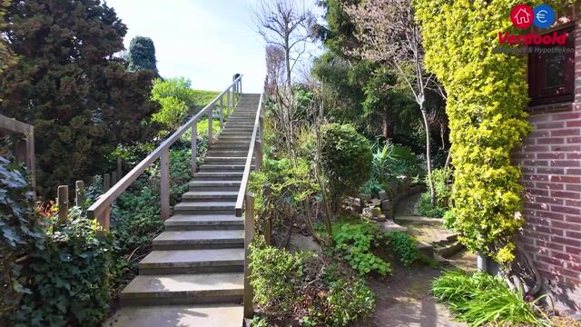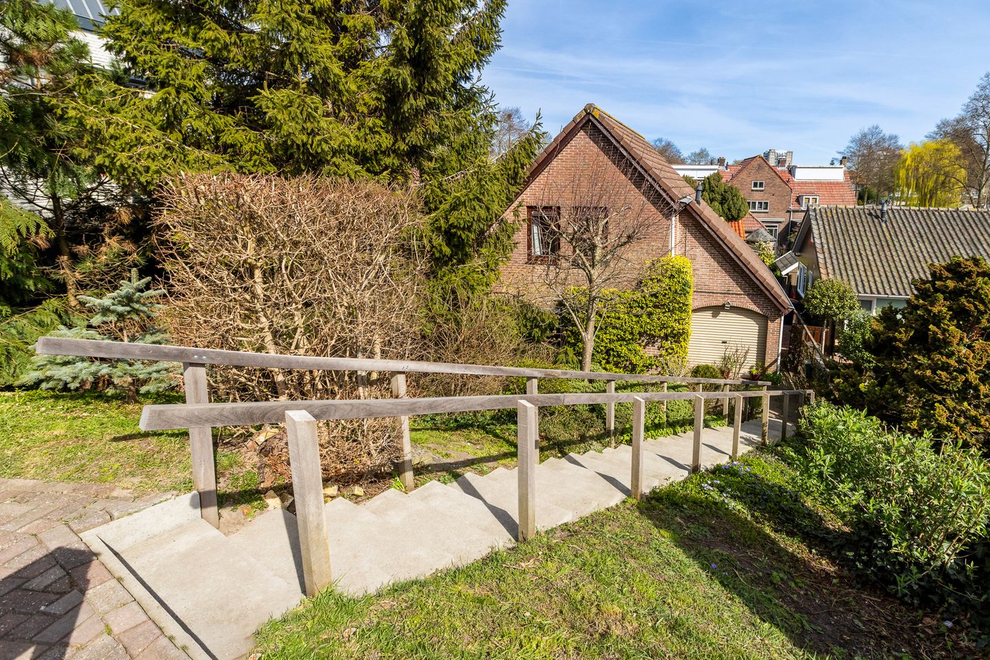 De woning beschikt over een tuin rondom, passend bij het vrijstaande karakter en de ligging onder aan de dijk. Vanaf de dijk is er een trap naar beneden richting de woning en de tuin. In de voortuin zorgen verschillende bomen en een pad met klinkers voor een verzorgde en groene entree.