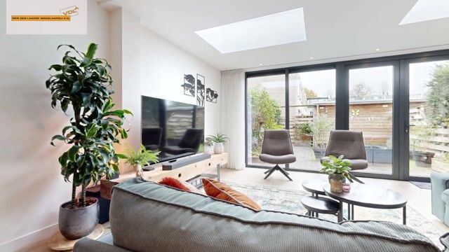 Through the spacious front garden, you enter the hallway with the meter cupboard and toilet. The bright living room is wonderfully spacious and filled with light thanks to the extension and large skylights. The floor has underfloor heating, ensuring optimal comfort. The open-plan kitchen (2018) has a modern look and is equipped with an induction cooktop, extractor hood, separate fridge and freezer, dishwasher, and combination oven. French doors lead to the northeast-facing backyard with a storage shed and back entrance.