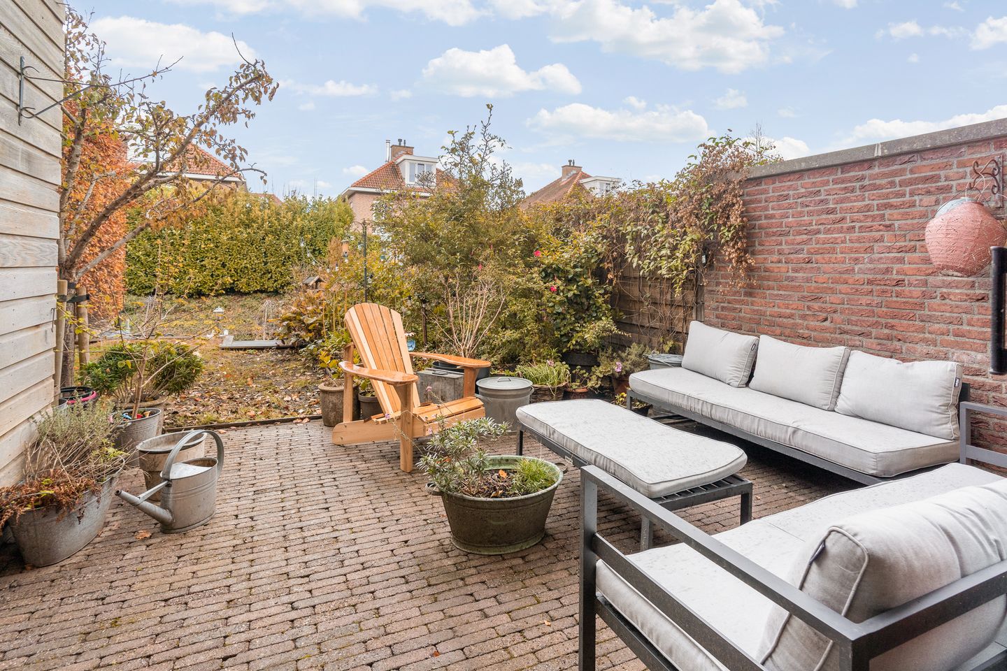 The southeast-facing backyard offers a delightful balance of sun and shade. In the morning, you can enjoy the sun near the rear façade, while later in the day you can relax on the terrace by the water, where the sun is almost always present. Additional storage space is available at both the front and rear of the house.