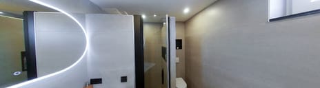 - Walk-in shower, bath, toilet, underfloor heating, sink, and washstand