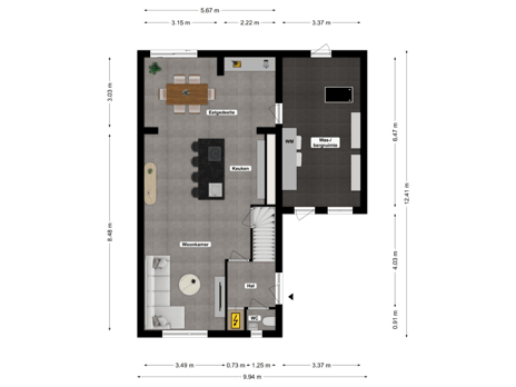 Ruime uitstekend afgewerkte woonkamer 11.81 x 5.11 voorzien van moderne tegelvloer met vloerverwarming, wanden en plafond in glad stucwerk, provisiekast onder trap, airconditioning en schuifpui naar tuin. Aan de voorzijde bevindt zich de zitkamer met fraaie tv-wand. Centraal in de woonkamer bevindt zich de open leefkeuken met kookeiland met gezellige eetbar. De keuken bestaat uit een hoogglans witte keukeninstallatie en is voorzien van de navolgende hoogwaardige apparatuur: grote koelkast, combimagnetron, (stoom) oven, vaatwasser en inductiekookplaat met geïntegreerde afzuigkap (Bora).
