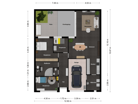 Via de schuifpui is er toegang tot de geheel omsloten, zonnige patio-tuin met aluminium overkapping voorzien van LED-verlichting, natuurstenen bestrating, buitenverlichting en zonwering. De tuin biedt optimale privacy en is ideaal voor ontspannen.