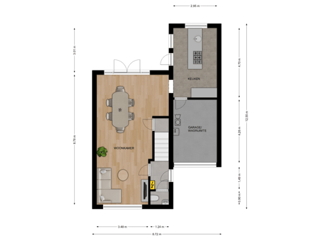 Begane grond: voortuin, oprit, entree, hal met plavuizenvloer, moderne meterkast, geheel betegeld zwevend toilet met fonteintje en trappenhuis. De woonkamer heeft een parketvloer, een bergkast onder de trap, airco-installatie en openslaande deuren naar de tuin. De keuken bevindt zich in de aanbouw achter de garage, heeft een tegelvloer en een moderne keuken-installatie met kookeiland en de navolgende apparatuur; koelkast, afzuigkap, vaatwasser, heteluchtoven met stoomfunctie, kookplaat en koffieapparaat. Vanuit hier is de garage inpandig bereikbaar. De garage heeft tevens een wasmachine-aansluiting, wordt verwarmd door een radiator, biedt plaats aan de C.V.-opstelling en is ook ideaal voor stalling en berging.