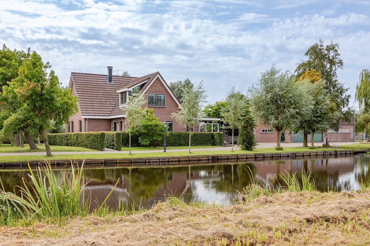 Het buitenterrein ademt ruimte en vrijheid. Naast de woning ligt de royale schuur (2014) met kelder (in gebruik als magazijn), een kantine en een kantoor. Er is krachtstroom, een toilet aanwezig en drie elektrische overheaddeuren. Voor de bouw van deze schuur is een eerdere loods afgebroken, waarbij de fundering in tact gebleven is. Verder is er op het terrein nog een garage/carport met vide, verschillende terrassen waarvan het hoofdterras volledig omheind is, een geitenweide en een dierenverblijf. Het weiland is afgescheiden met een hek, dit deel heeft een agrarische bestemming en is geschikt voor bijvoorbeeld het houden van kleinvee. Voor de watersportliefhebber is er een eigen aanlegsteiger met botenhuis.