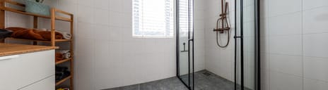 De badkamer is ruim, netjes afgewerkt en heeft alles wat je maar wenst: een heerlijke inloopdouche, een fraai wastafelmeubel en genoeg bewegingsruimte. Wakker worden met het hele gezin hoeft hier nooit ‘stressvol’ te zijn – iedereen heeft simpelweg voldoende plaats.