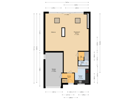 - 60 m² (8.00 metre deep and 7.50 metre wide)