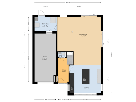 Via de voordeur stap je binnen in de hal met toilet en trapopgang naar boven, waar je ook de meterkast (3 fasen) vindt. Vanuit hier loop je zo de ruime, tuingerichte woonkamer in, die baadt in het licht dankzij de schuifpuien aan twee zijden. De moderne keuken is van alle gemakken voorzien met inbouwapparatuur. Aan de woonkamer grenst de praktische bijkeuken met witgoedaansluitingen en de CV-ketel, én een doorgang naar de inpandige garage. Perfect voor het stallen van fietsen, hobby’s of de auto.