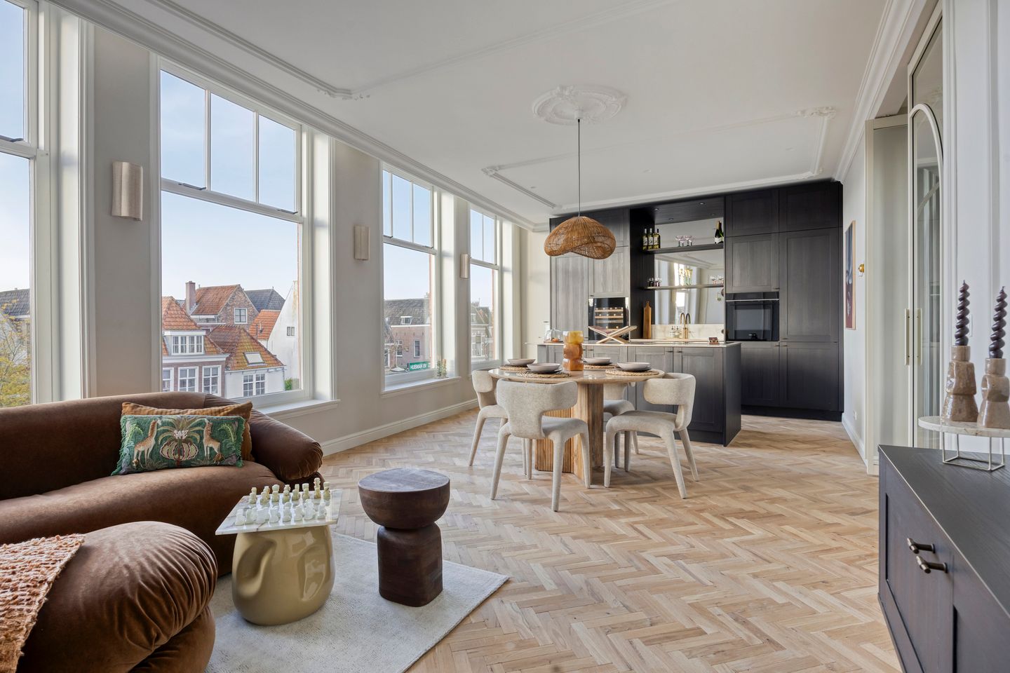 - Lichte en royale woonkamer met hoge plafonds, strak gestuukte wanden en grote raampartijen met prachtig uitzicht op de Nieuwe Rijn;