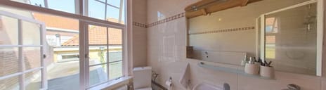 Achter de eetkamer, voor de woonkamer met aangrenzend de open keuken voorzien van een vaatwasser, koelkast, combi oven, oven, gaskookplaat en afzuigkap. Verder is er een separaat toilet. De vloeren zijn afgewerkt met houten vloerdelen. Vanaf de overloop heeft u toegang tot het riante dakterras, waar u heerlijk kunt vertoeven.