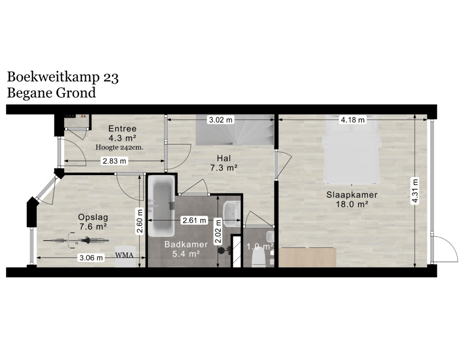 Via het voorportaal bereik je het moderne toilet, de meterkast en de garderoberuimte. Een deur leidt je naar de eerste slaapkamer op de begane grond — ideaal als werkplek, logeerkamer of speelkamer. Vanuit de slaapkamer heeft u toegang tot de achtertuin. De badkamer is een fijne plek om helemaal tot rust te komen, compleet met ligbad met whirlpoolfunctie, inloopdouche en een stijlvol wastafelmeubel.