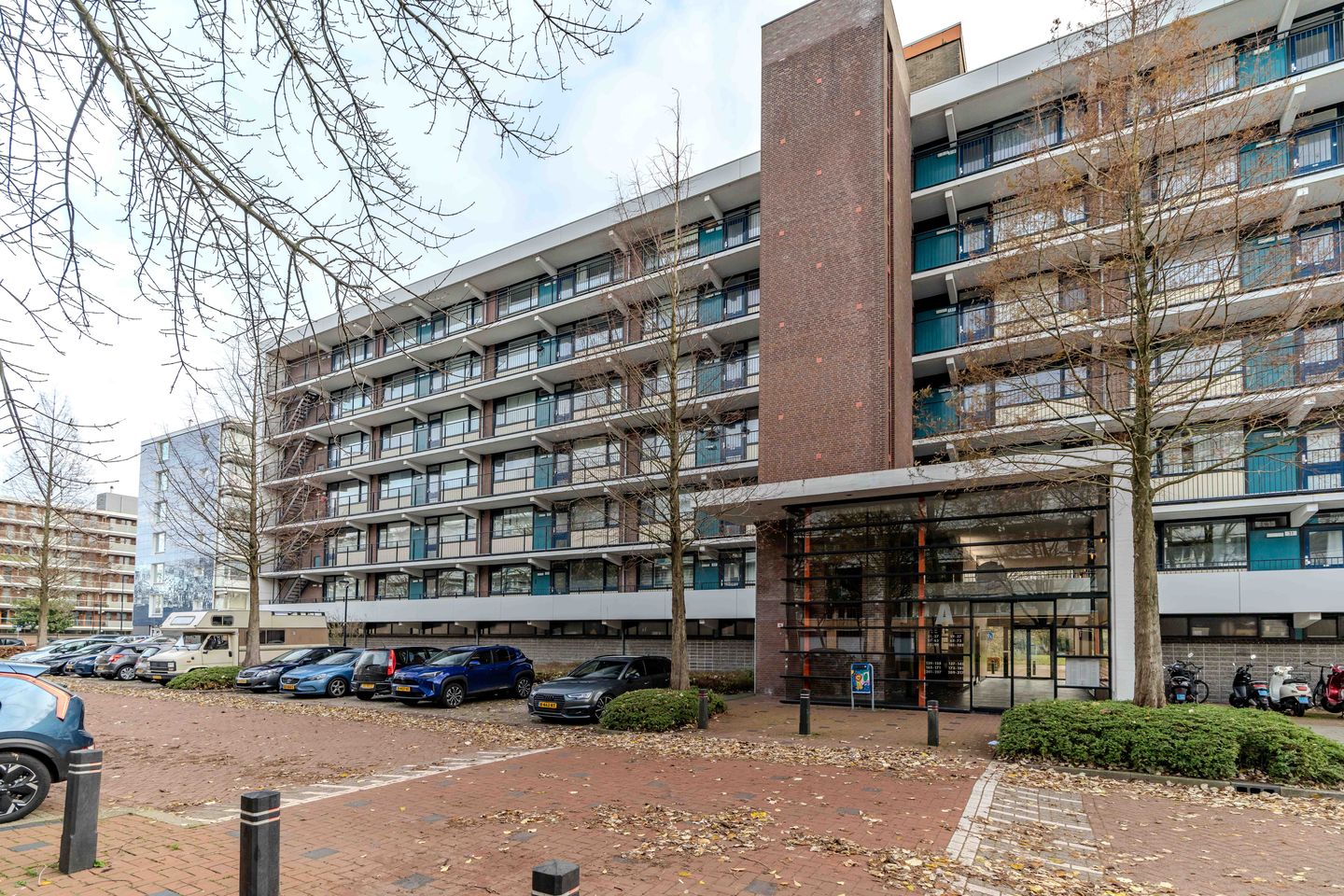 Fraaie, ruim en afgesloten entree met bellentableau, trappenhuis en lift; via de galerij komt u bij de appartementen.