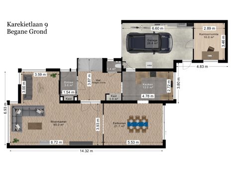 Main entrance to the house on the side. Spacious hall with toilet. Double doors to the living room. Exceptionally spacious living room with L-shaped front room (approx. 8.7 x 6.9 / 3.9 m) with full-wide seating area with a design fireplace and lots of windows for lightening. The rear room (approx. 5.5 x 3.9 m) has a sliding door to the backyard and a doorway to the half open kitchen. Spacious modern open kitchen with U-shaped kitchen layout richly equipped with built-in appliances. Spacious backyard towards the southeast with plenty of sun hours with terrace area. The garage is also accessible from the garden.