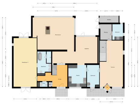 Vanuit de voortuin komt u in de ruime entree en ervaart u de enorme ruimte en luxe die deze woning zo bijzonder maakt. De entree met de trap naar de eerste verdieping, en aansluitend toegang tot een toilet, de slaapkamer met badkamer, keuken bijkeuken, woonkamer, eetkamer en kantoor.