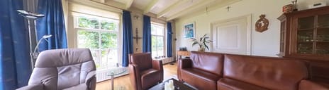 De ruime kamer (vroeger de opkamer) is door de grote ramen een heerlijk lichte kamer, maar tijdens een donkere gure winteravond is het hier ook heerlijk vertoeven dankzij de houtkachel, stel u eens voor lekker bij een brandend haardvuur op de bank in zo’n huis als dit; dat is toch echt genieten! Mocht u nou niets met een houtkachel hebben, dan kunnen we u gerust stellen; er is gelukkig ook gewoon centrale verwarming aanwezig met draadloze thermostaat.
