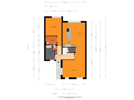 Entree/hal, toilet met fonteintje, meterkast en toegang tot de inpandige berging / bijkeuken met aansluiting voor de was- en droogapparatuur. Deze ruimte heeft tevens een directe toegang vanaf de buitenzijde. Vanaf de hal is tevens de slaap- en badkamer op de begane grond te bereiken. De slaapkamer is een ruim vertrek met voldoende ruimte voor een grote kastenwand en een bureau. De badkamer ligt naast de slaapkamer en is uitgerust met een inloopdouche, wastafelmeubel en een toilet. De woonkamer bevindt zich aan de voorzijde van de woning en kenmerkt zich door de vele raampartijen. Er is een praktische trapkast aanwezig waar tevens de warmtepomp staat opgesteld. Middels stalen schuifdeuren is de keuken te bereiken. Door de 2,40 meter uitbouw is er een echte woonkeuken ontstaan waar met een groot gezelschap getafeld kan worden. De keuken beschikt over een kookeiland en is compleet uitgevoerd met een 6-pits inductiekookplaat met afzuigkap, een koelkast, diepvries, koffiemachine, vaatwasser en een combi oven. Middels een aluminium schuifpui is het aangrenzende terras te bereiken. Op de gehele begane grond ligt een visgraat vloer met bies (PVC) en geheel voorzien van vloerverwarming.