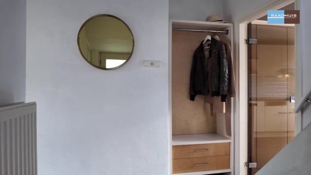 De overloop is slim ingedeeld met vaste kastruimte, een extra wastafel en de aansluiting voor de wasmachine. Onder de schuine kap zijn brede inbouwkasten geplaatst. De CV-opstelling bevindt zich in een aparte bergruimte.