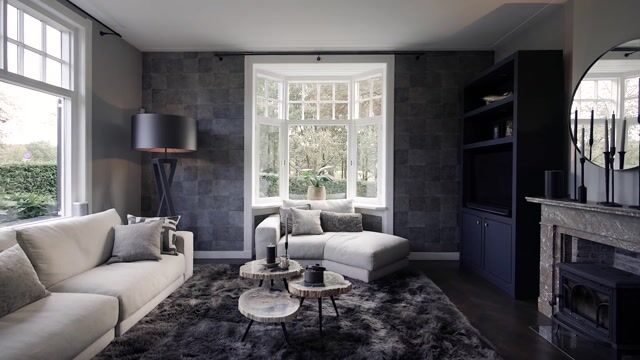 Aan de linkerzijde vindt u een gezellige zitkamer met een mooie erker, veel lichtinval en een marmeren schouw met houtkachel. De hoge plafonds, visgraatvloer en fraaie wandafwerking zorgen voor een warme uitstraling. Aan de achterzijde ligt de ruime eetkamer met marmeren schouw en uitzicht op de tuin — een plek waar het gezin samenkomt en waar gasten zich direct welkom voelen. Ook hier zorgen ramen aan drie zijden voor prachtig licht gedurende de dag.