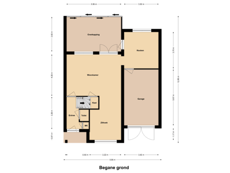 Bij binnenkomst aan de voorzijde betreed je de entree, die toegang biedt tot de meterkast, de toiletruimte, de woonkamer en de trapopgang naar de eerste verdieping. De entree biedt voldoende ruimte om jassen en schoenen netjes op te bergen.