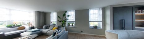 De diagonaal in visgraat gelegde pvc-vloer benadrukt het gevoel van ruimte. Grote ramen zorgen voor een prachtige lichtinval en een fijne verbinding met buiten. In de living zorgen maatwerkoplossingen zoals een sfeervolle erkerbank, vaste kasten en hoogwaardige stoffering voor een tijdloze en uitnodigende uitstraling.