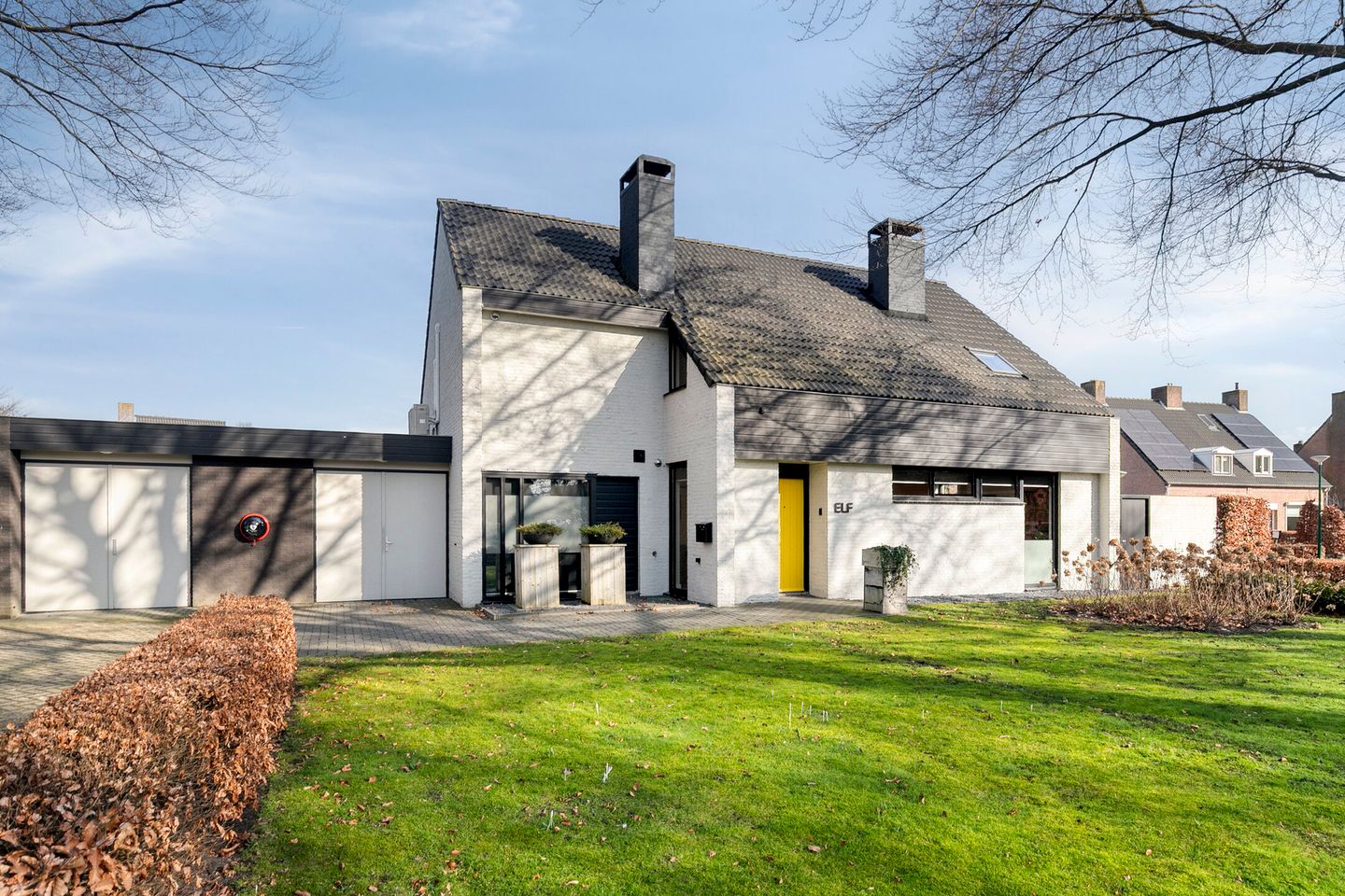 De garage met elektrische roldeur geeft toegang tot een separate oprit.