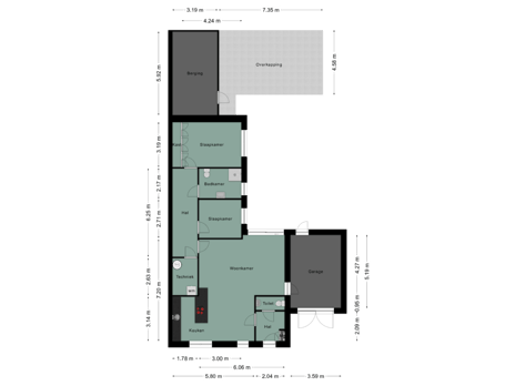 De woning is volledig afgewerkt met een stijlvolle, tijdloze tegelvloer die niet alleen prettig aanvoelt onder je voeten, maar ook eenvoudig te onderhouden is. In de hal tref je het toilet met modern hangend closet en fonteintje. Strak afgewerkt in een rustige, eigentijdse stijl. Ook de uitgebreide meterkast bevindt zich hier, compleet met krachtstroomaansluiting. Een glazen deur leidt je naar het hart van het huis: het open leefgedeelte.