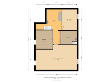 Vanuit het achterportaal is er toegang tot het souterrain. Het souterrain is verdeeld in 5 compartimenten, van ca. 7,3m2, 11m2, 12m2, 13m2 en 35m2. Eén compartiment is voorzien van verwarming. De woning is geheel onderkelderd en het souterrain is voor meerdere doeleinden geschikt. Vanuit één ruimte is er toegang tot de tuin.