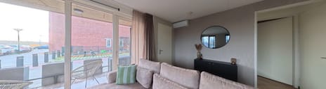 De woonkamer met open keuken heeft dankzij de aanwezige ramen en de grote pui, met een deur naar het terras, veel natuurlijk lichtinval. Er is ruimte voor zowel een zit- als een eethoek en er is airconditioning aanwezig. Daarnaast is er vanuit de woonkamer toegang tot de inpandige berging en de tussenhal, die zorgt voor de verbinding naar de slaapkamer en het gedeeltelijk betegelde toilet.