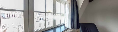 De moderne trap in de woonkamer leidt naar de sfeervolle slaapkamer met badkamer, in de nok van het stijlvolle monument. Met een vloeroppervlakte van circa 15 m2, exclusief de berging en vaste kasten in de schuinte van het dak, is dit een ruimte van goed formaat. Grote dakramen met verduisteringsgordijnen zorgen voor veel lichtinval, en de spiegeldeuren maken de slaapkamer optisch nog groter. De moderne wastafel met meubel en de douche met lage instap roepen het gevoel van een luxe hotelkamer op, maar dan in uw eigen huis.