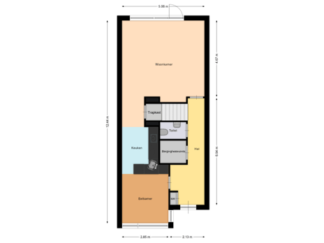 Onder de trap bevindt zich een ruime trapkast. De zitkamer sluit halfopen aan op de keuken en heeft openslaande deuren naar de tuin. Vanuit de woonkamer is een tussenportaal bereikbaar met toegang tot het toilet en de trap naar de eerste verdieping.