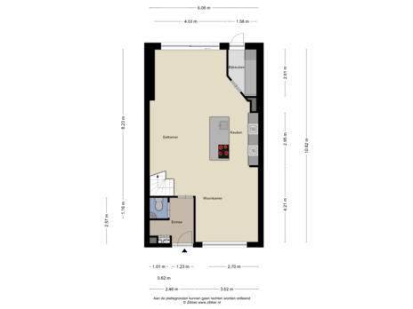 De entree (3m²) biedt toegang naar de geïsoleerde kruipruimte, het toilet en de garderobenis.